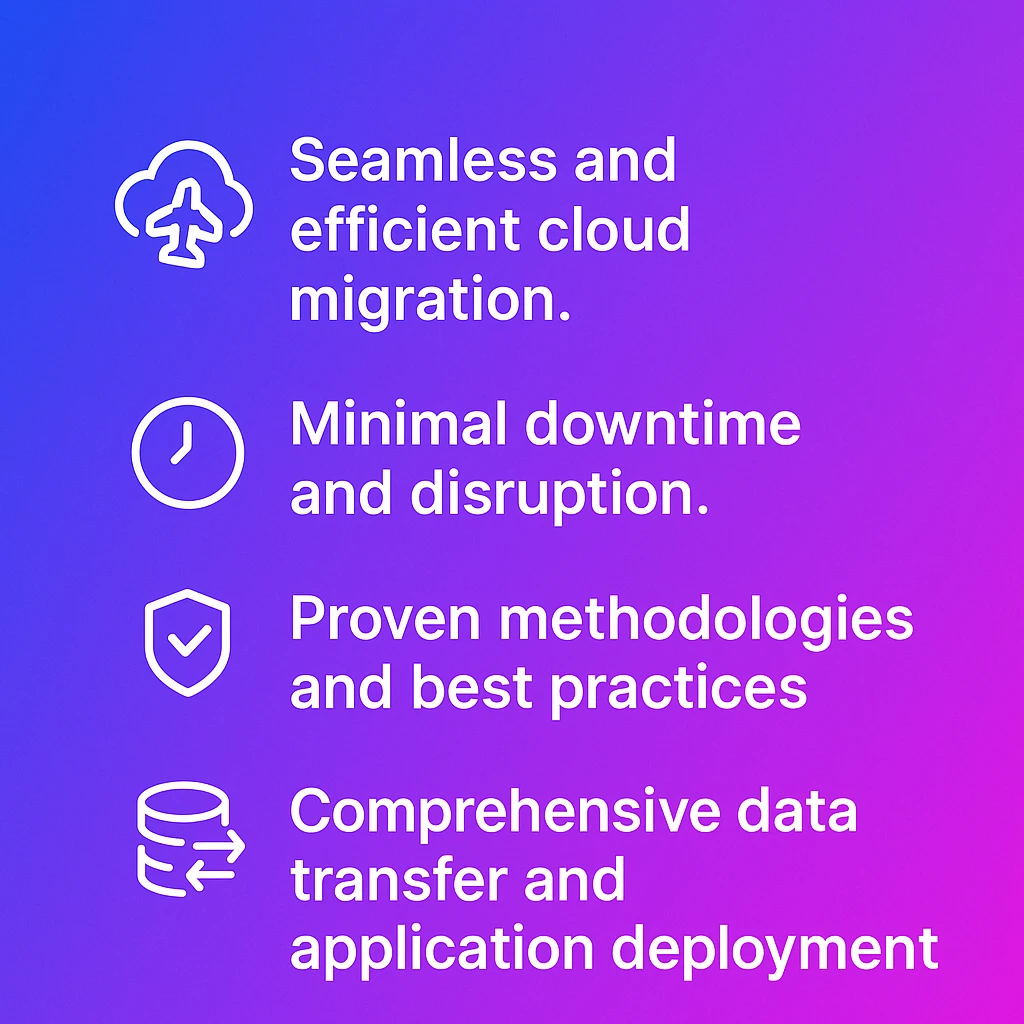 Migrating to the cloud can be a complex and challenging process. Our experienced team ensures a seamless and efficient migration, minimizing downtime and disruption to your business operations. We utilize proven methodologies and best practices to ensure a smooth transition to your new cloud infrastructure. We offer various migration strategies, including lift-and-shift, re-platforming, and re-architecting, to accommodate different application types and business requirements. We handle all aspects of the migration process, from data transfer and application deployment to testing and validation.