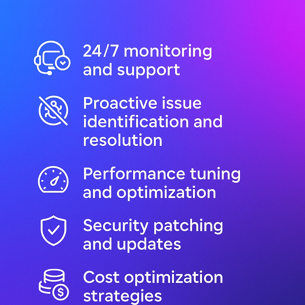 Once your cloud infrastructure is up and running, we provide ongoing management and optimization services to ensure optimal performance, security, and cost-effectiveness. Our proactive monitoring and maintenance services help identify and resolve issues before they impact your business. We also continuously optimize your cloud infrastructure to ensure it remains aligned with your evolving business needs. Key aspects of our management services include resource monitoring, performance tuning, security patching, and cost optimization.
