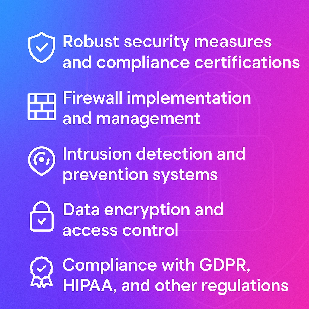Security is paramount in the cloud. We offer comprehensive cloud security services to protect your data and applications from evolving threats. Our security experts implement robust security measures, including firewalls, intrusion detection systems, and data encryption, to ensure the confidentiality, integrity, and availability of your cloud resources. We also help you meet regulatory compliance requirements, such as GDPR and HIPAA.
